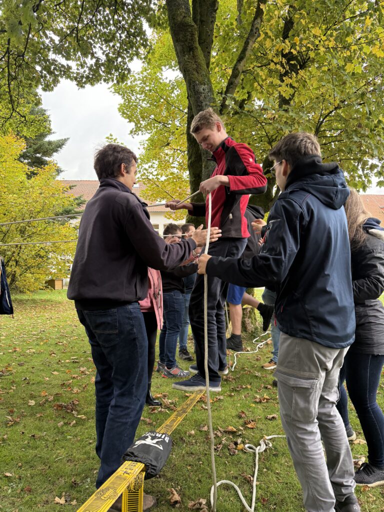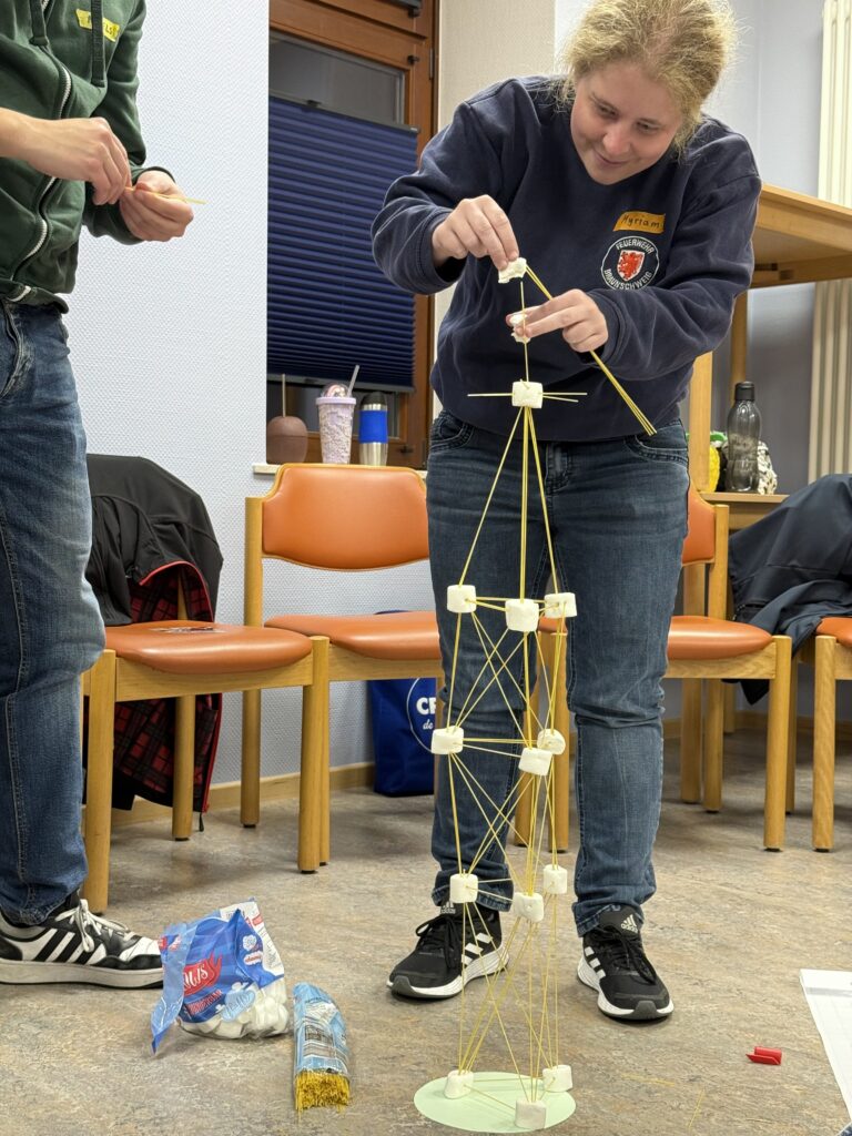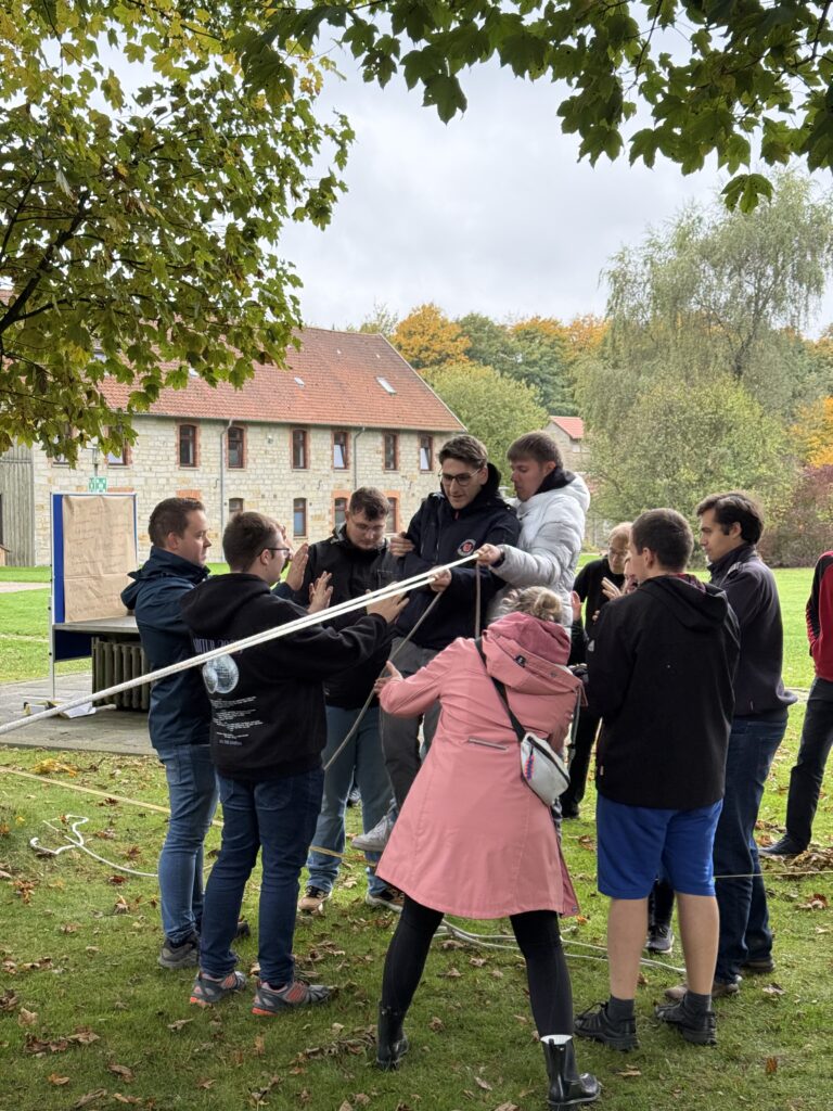 Auch erlebnispädagogische Methoden kamen nicht zu kurz: Auf der Slackline oder bei Teamübungen mit einfachen Regenrinnen konnten die Teilnehmenden spielerisch Teambuilding-Strategien ausprobieren, die sich direkt in den Alltag der Jugendfeuerwehren übertragen lassen.